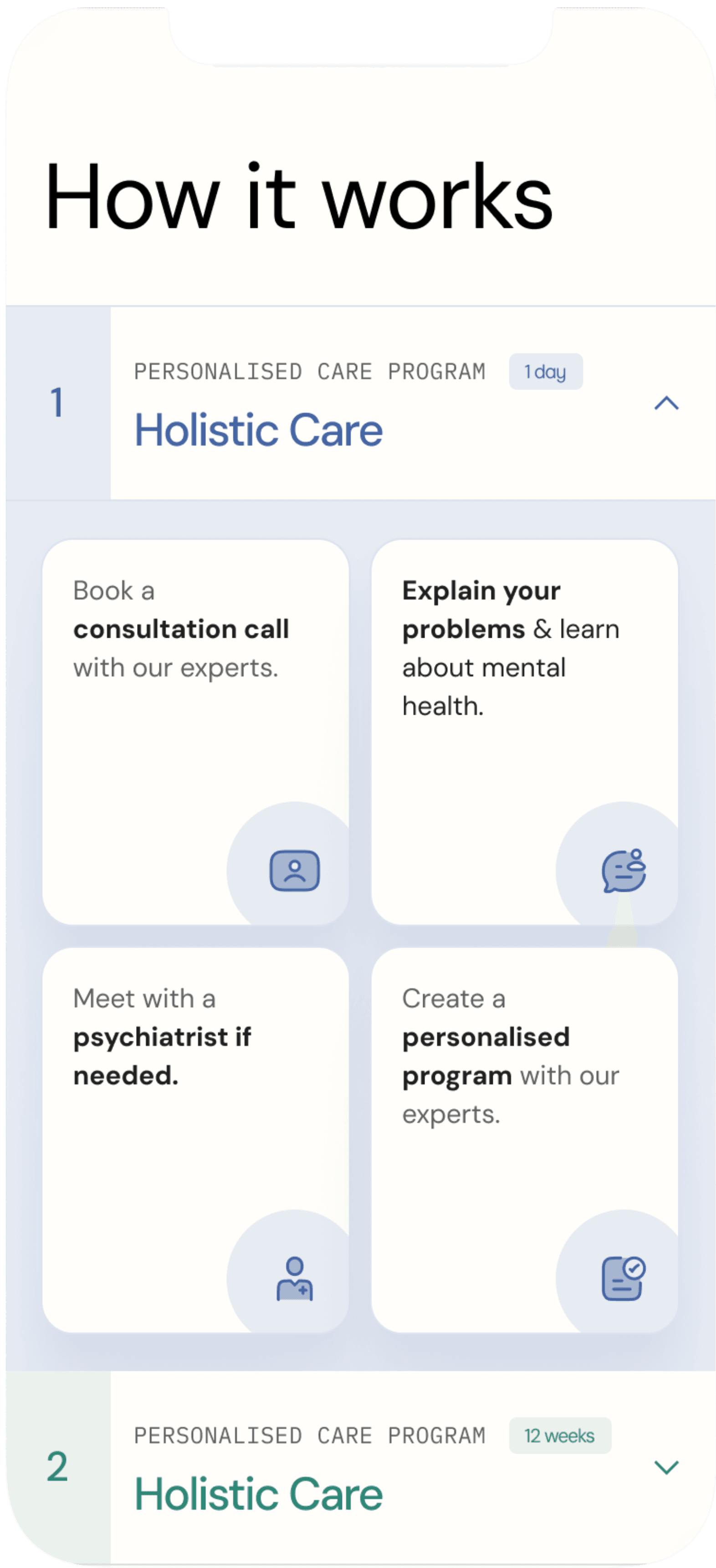 Ensure the user fully understands the product to build trust before leading them to a call to a action. In health tech, particularly mental health, establishing trust is crucial. The interface and content should be assuring without being triggering.